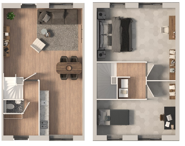 Deze woning is uitgevoerd met twee lagen met een plat dak. De woning heeft een ruime woonkamer en een open keuken. Op de tweede verdieping bevind zich een complete badkamer. De woning heeft 2 slaapkamers. Beukmaat 5,7m¹ heeft 3 slaapkamers.