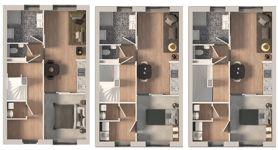 Dit woningtype bestaat uit een 3 tal zelfstandige woningen. Met een woonkamer en een open keuken, biedt deze woning ruimte aan alleenstaande of startende jongeren. Door de grote raampartijen kunnen de bewoners genieten van veel lichtinval. De uitvoering begint bij een beukmaat 5,4m¹ en kan met 300mm worden vergroot naar 5,7m¹ enz.